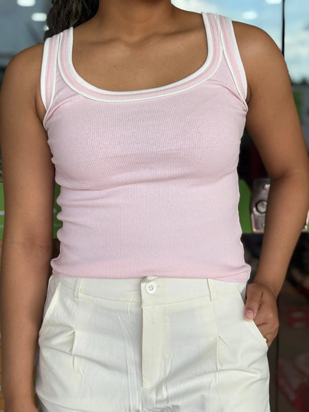 Uma peça essencial reinventada com um toque de estilo sporty e retrô! Nossa Regata Canelada se destaca pelo seu design Ringer, que apresenta um charmoso viés duplo em cor contrastante (Off-White/Branco) na gola e nas cavas.