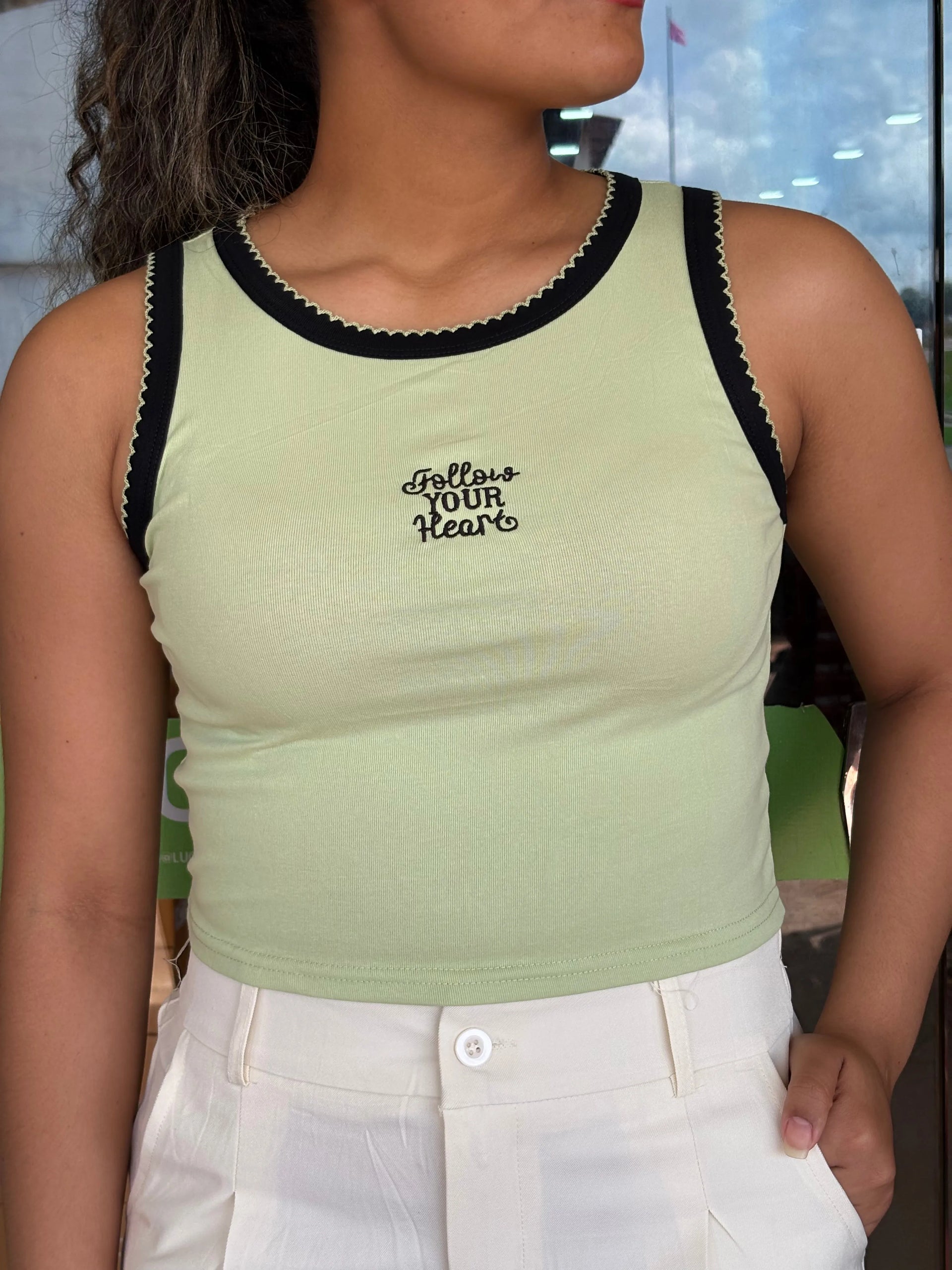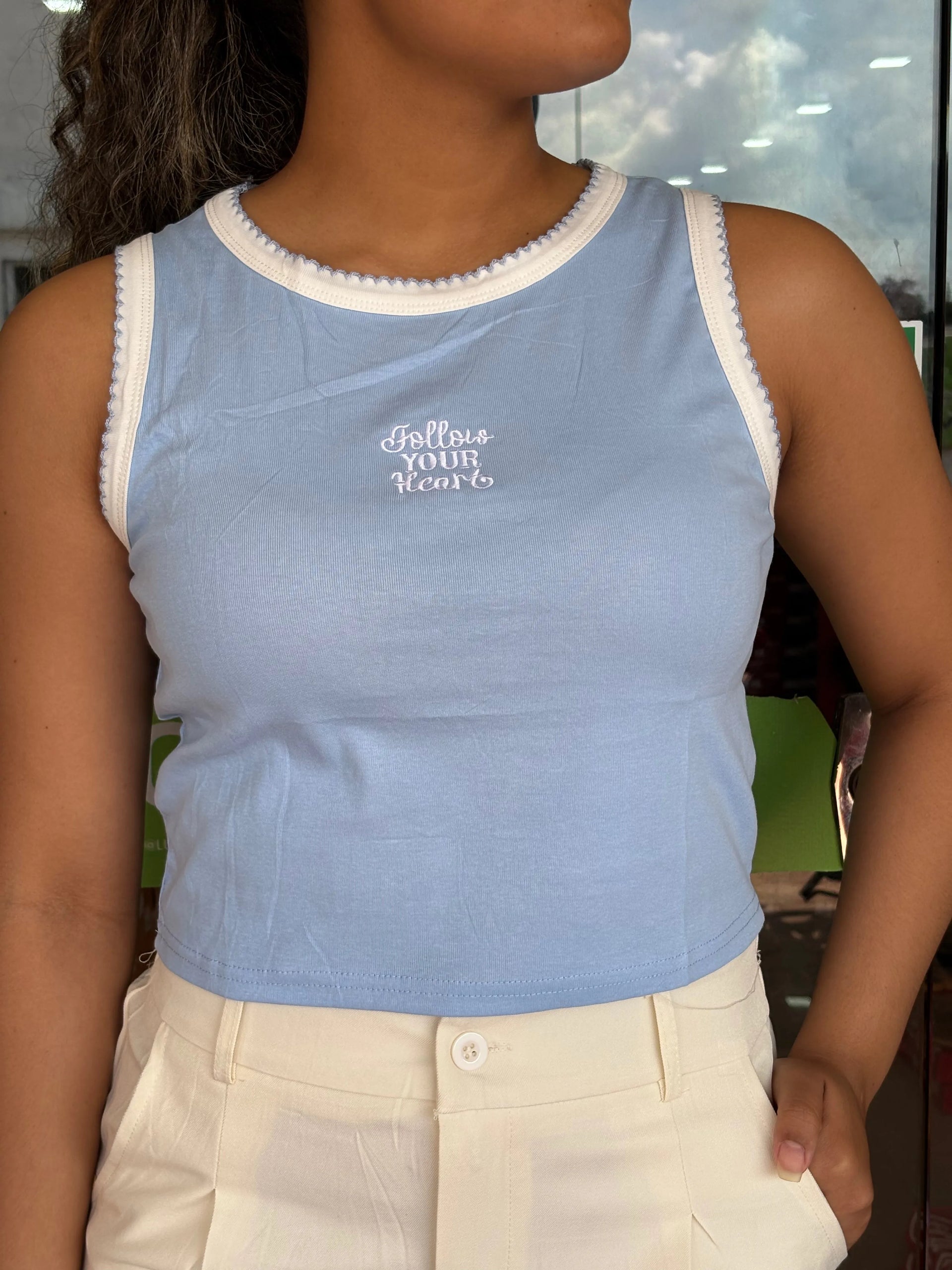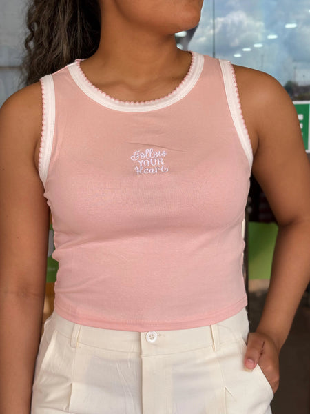 • Bordado Gráfico: A frase "Follow Your Heart"