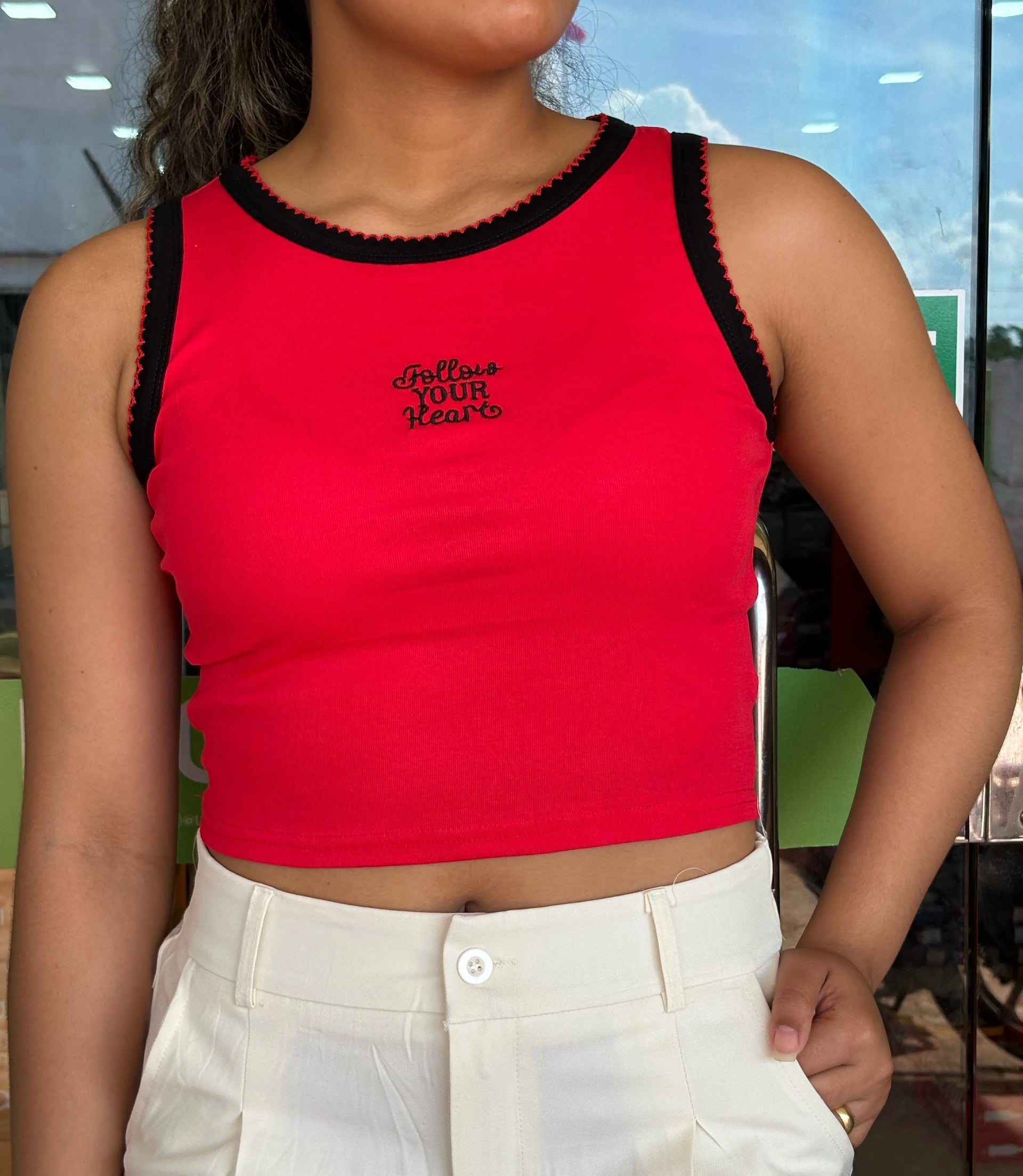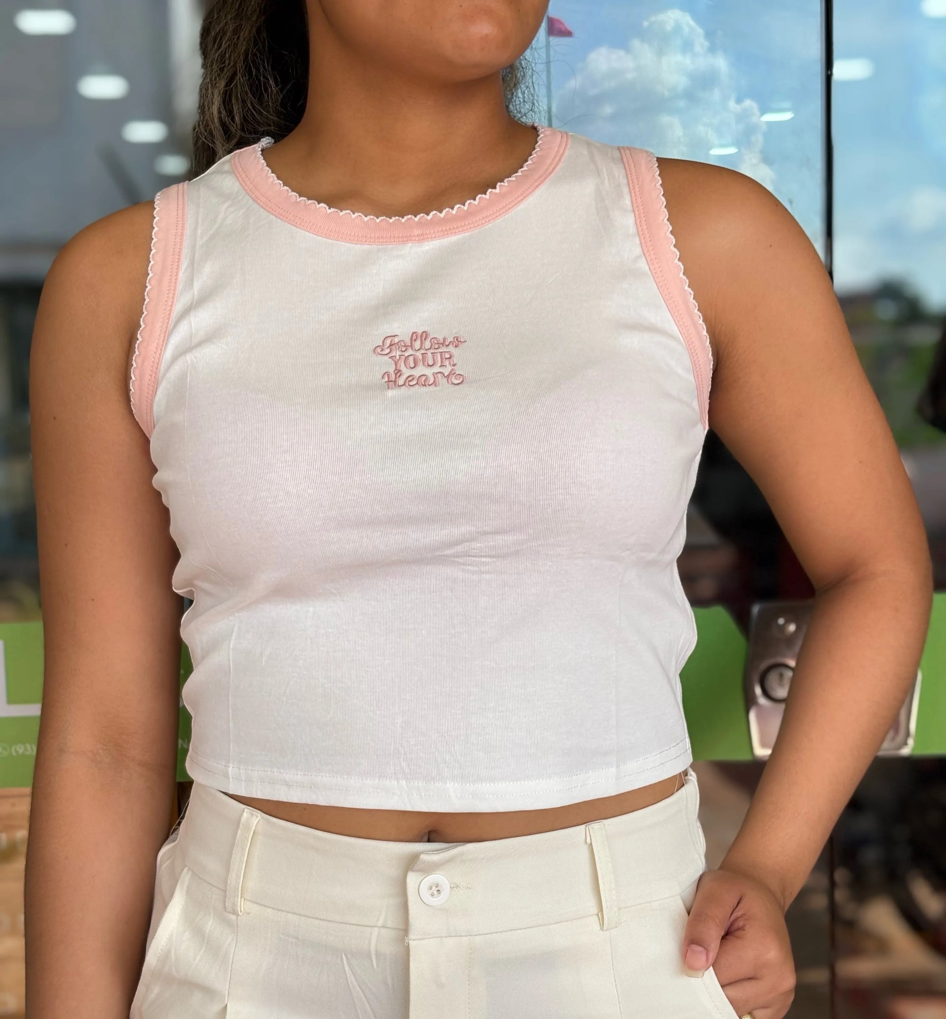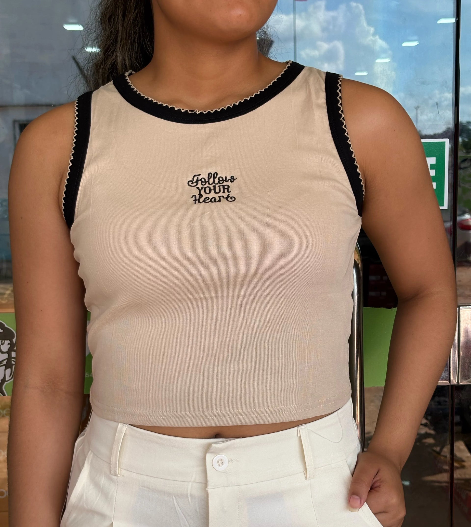 • Bordado Gráfico: A frase "Follow Your Heart"