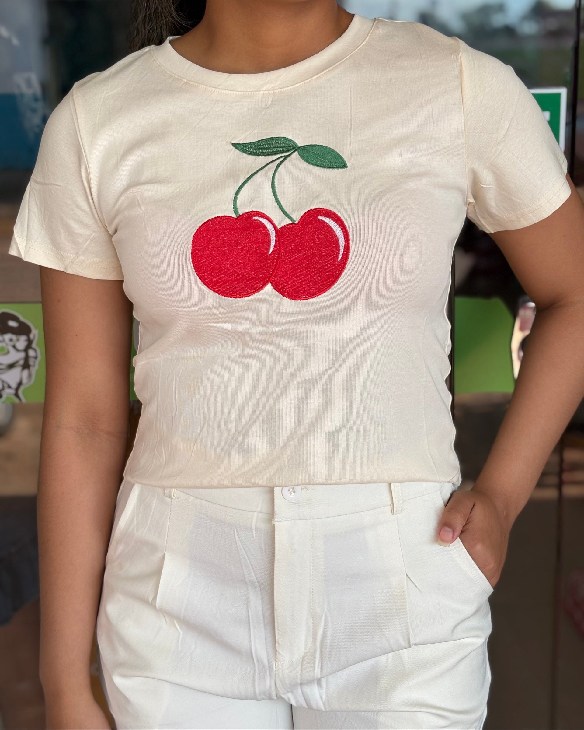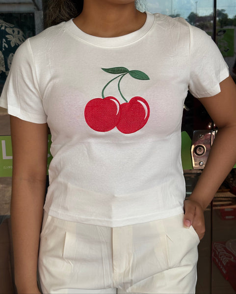 Confeccionada em 100% Algodão, garante excelente respirabilidade. As cores de fundo é perfeito para o destaque da Estampa de Cerejas vibrantes no centro, adicionando um toque fun e retrô ao seu look. Perfeita para combinar com jeans, saias e criar um visual descontraído.