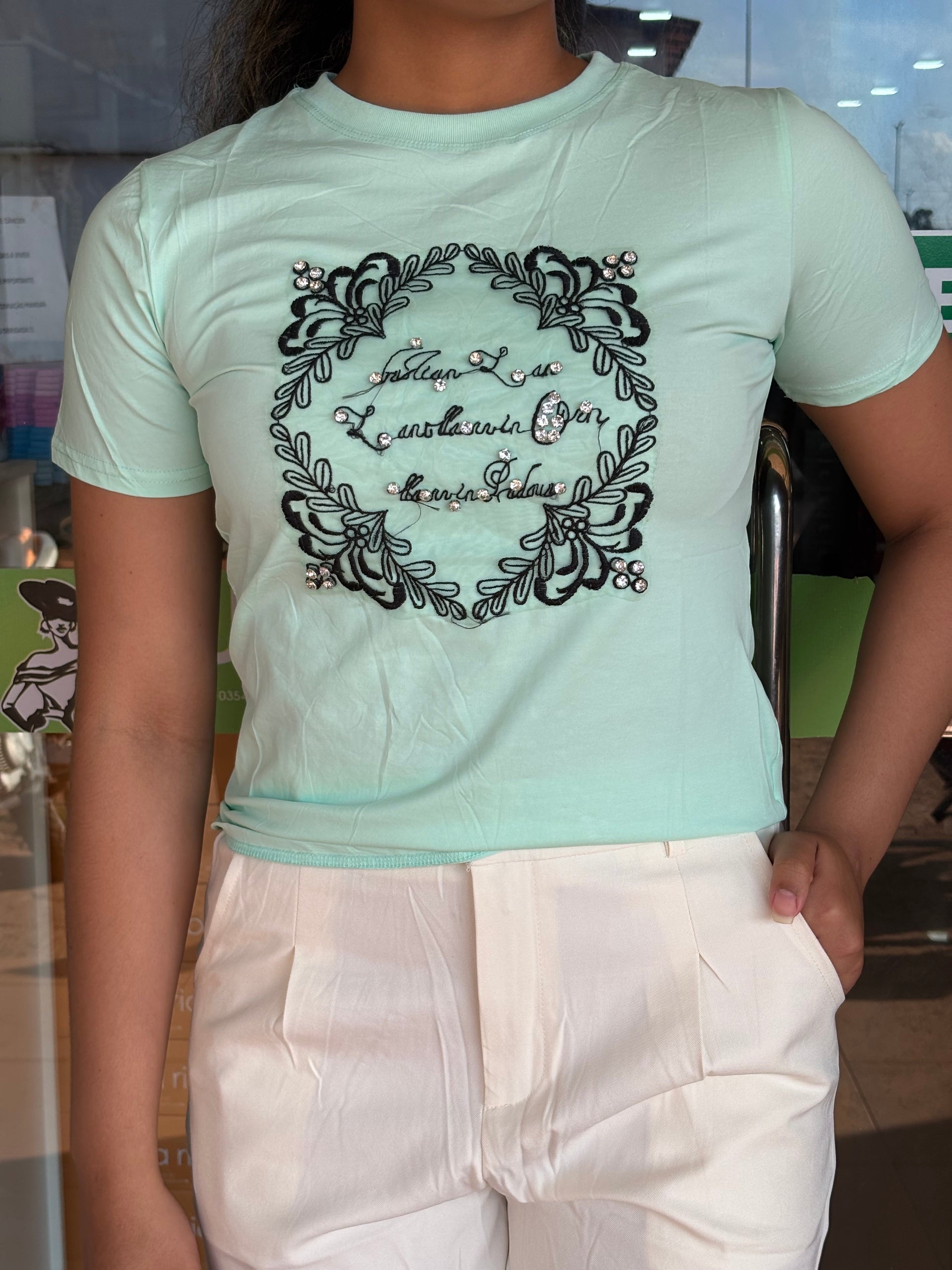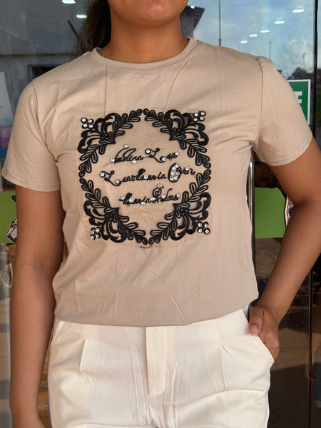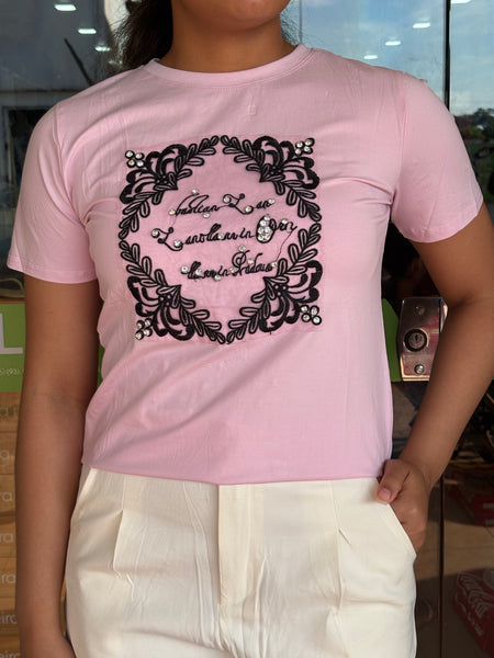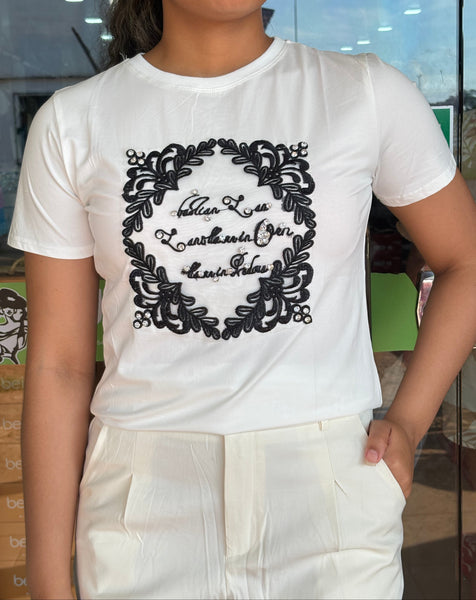 As cores é realçada pela aplicação centralizada em preto com design ornamental. Pequenos pontos de Strass são adicionados à aplicação, conferindo um brilho sutil e elegante. É a peça perfeita para elevar um look casual com um toque de sofisticação.